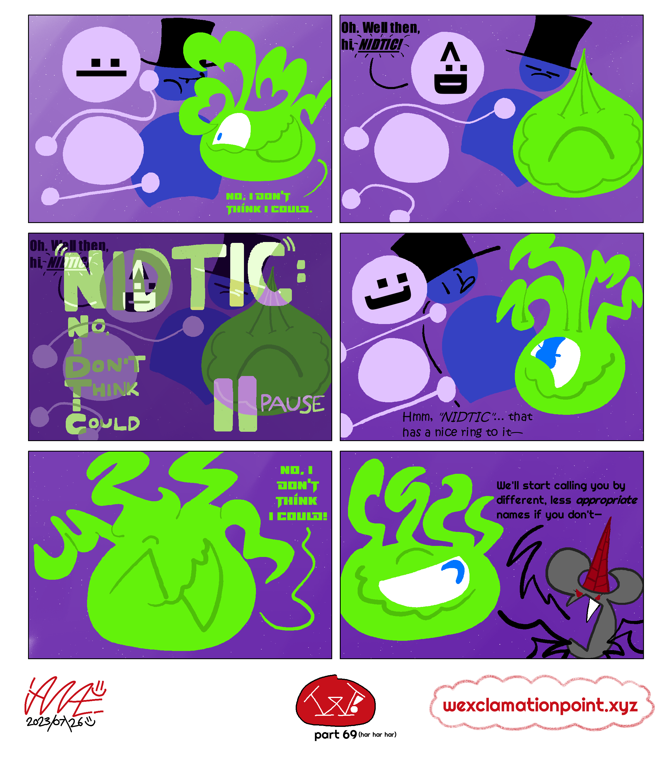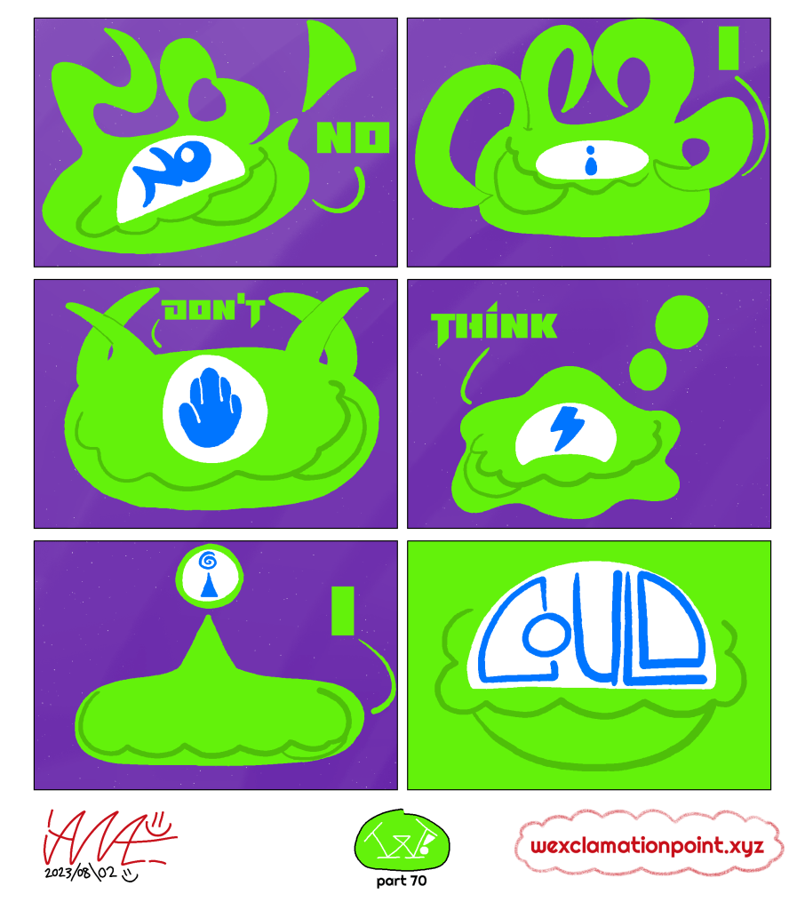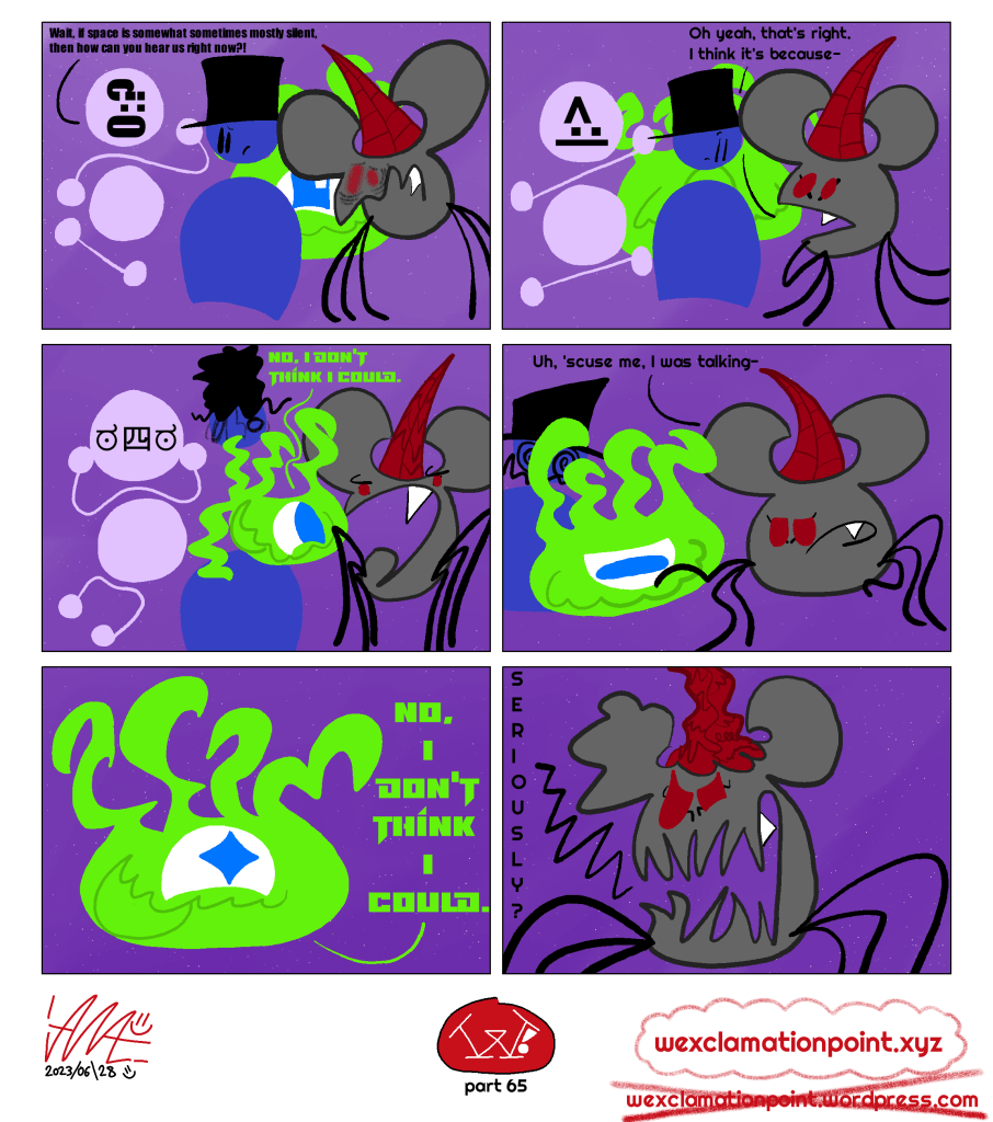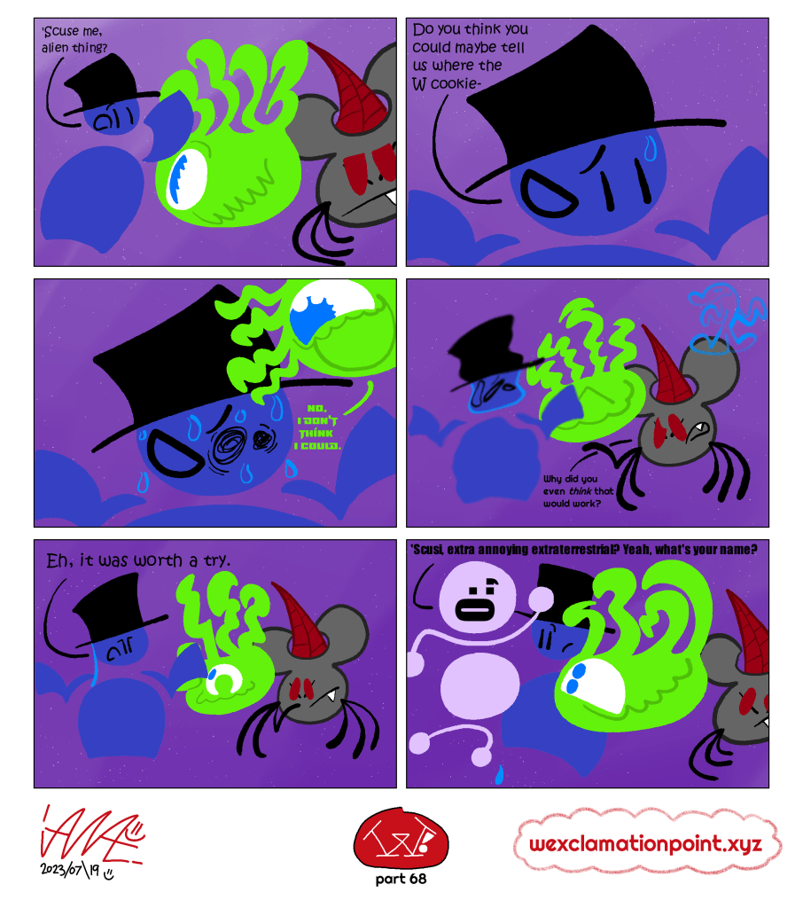 Oh hey, didn’t see ya there! I’m Ian A., usually stylized as “iANA.=)”, and sometimes just “ian=)”. I’m some weirdo who draws a whole lot! One of these things what I draw is called “W!” (Full name: “W! : The Enduring Quest for the W Cookie”) and it’s updated (hopefully) every Wednesday! Or Thursday! It’s about three friends trying to fight off idiots they come across while trying to find a specific W cookie that got stolen! You can check that out at https://wexclamationpoint.xyz =) - I used to have another webcomic—Nothing But Stick Figures—that went from Feb 20, 2016 to Mar 23, 2022. Six years of mediocre punchlines, wow! Oh also I do other things and whatnot, you can see those at https://the-ian-ashleum.neocities.org if you like!