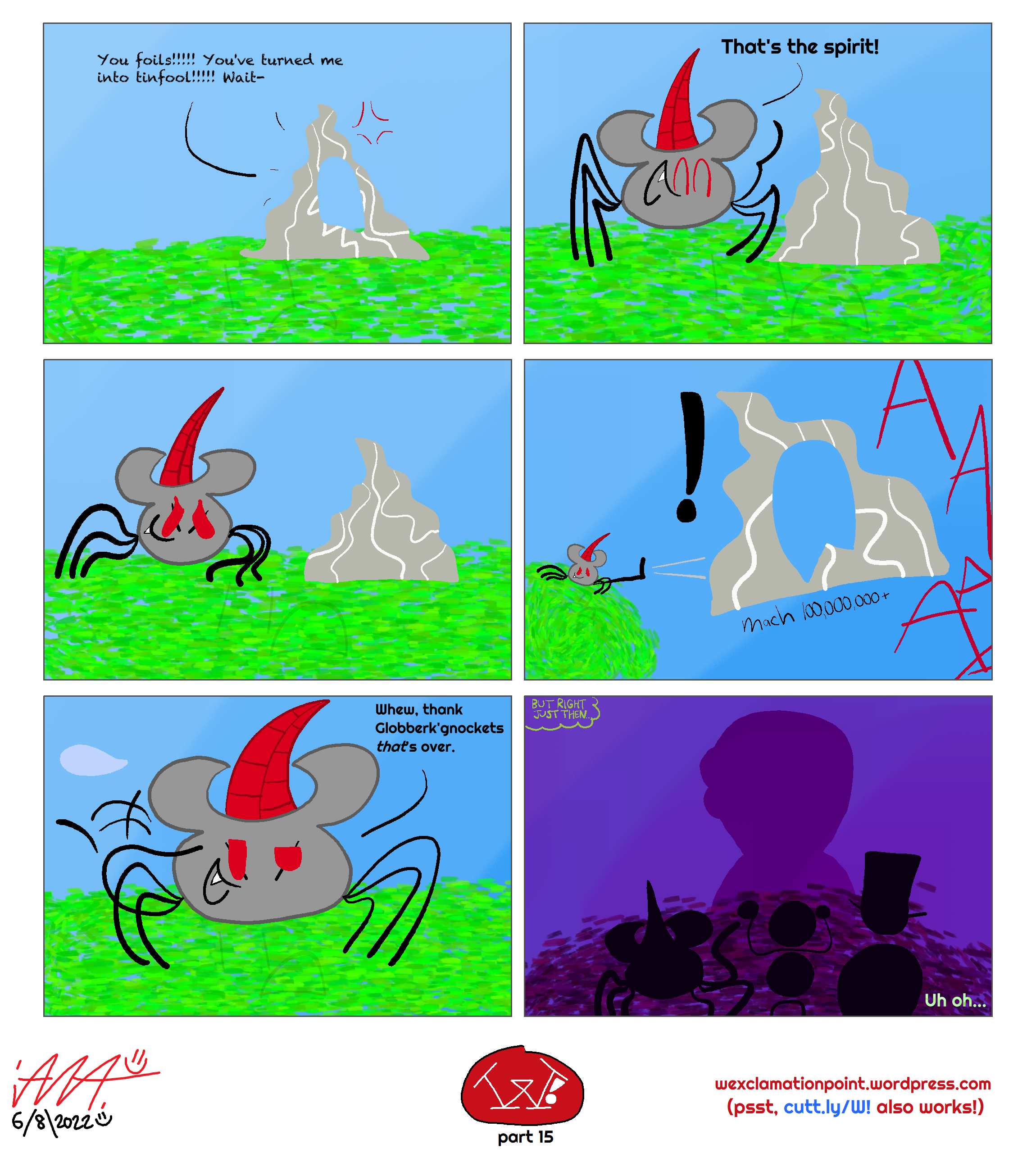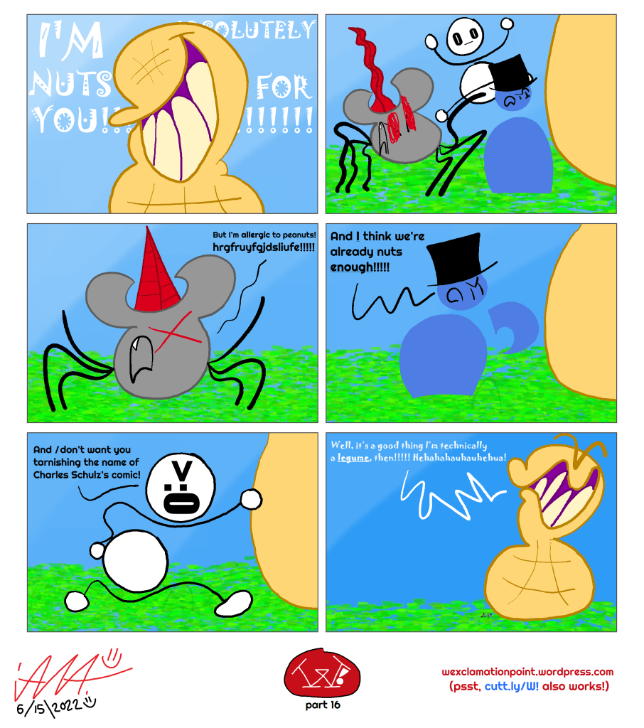 Oh hey, didn’t see ya there! I’m Ian A., usually stylized as “iANA.=)”, and sometimes just “ian=)”. I’m some weirdo who draws a whole lot! One of these things what I draw is called “W!” (Full name: “W! : The Enduring Quest for the W Cookie”) and it’s updated (hopefully) every Wednesday! Or Thursday! It’s about three friends trying to fight off idiots they come across while trying to find a specific W cookie that got stolen! You can check that out at https://wexclamationpoint.xyz =) - I used to have another webcomic—Nothing But Stick Figures—that went from Feb 20, 2016 to Mar 23, 2022. Six years of mediocre punchlines, wow! Oh also I do other things and whatnot, you can see those at https://the-ian-ashleum.neocities.org if you like!