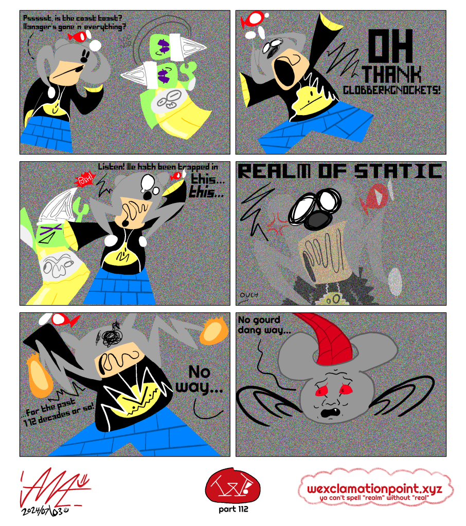 Oh hey, didn’t see ya there! I’m Ian A., usually stylized as “iANA.=)”, and sometimes just “ian=)”. I’m some weirdo who draws a whole lot! One of these things what I draw is called “W!” (Full name: “W! : The Enduring Quest for the W Cookie”) and it’s updated (hopefully) every Wednesday! Or Thursday! It’s about three friends trying to fight off idiots they come across while trying to find a specific W cookie that got stolen! You can check that out at https://wexclamationpoint.xyz =) - I used to have another webcomic—Nothing But Stick Figures—that went from Feb 20, 2016 to Mar 23, 2022. Six years of mediocre punchlines, wow! Oh also I do other things and whatnot, you can see those at https://the-ian-ashleum.neocities.org if you like!