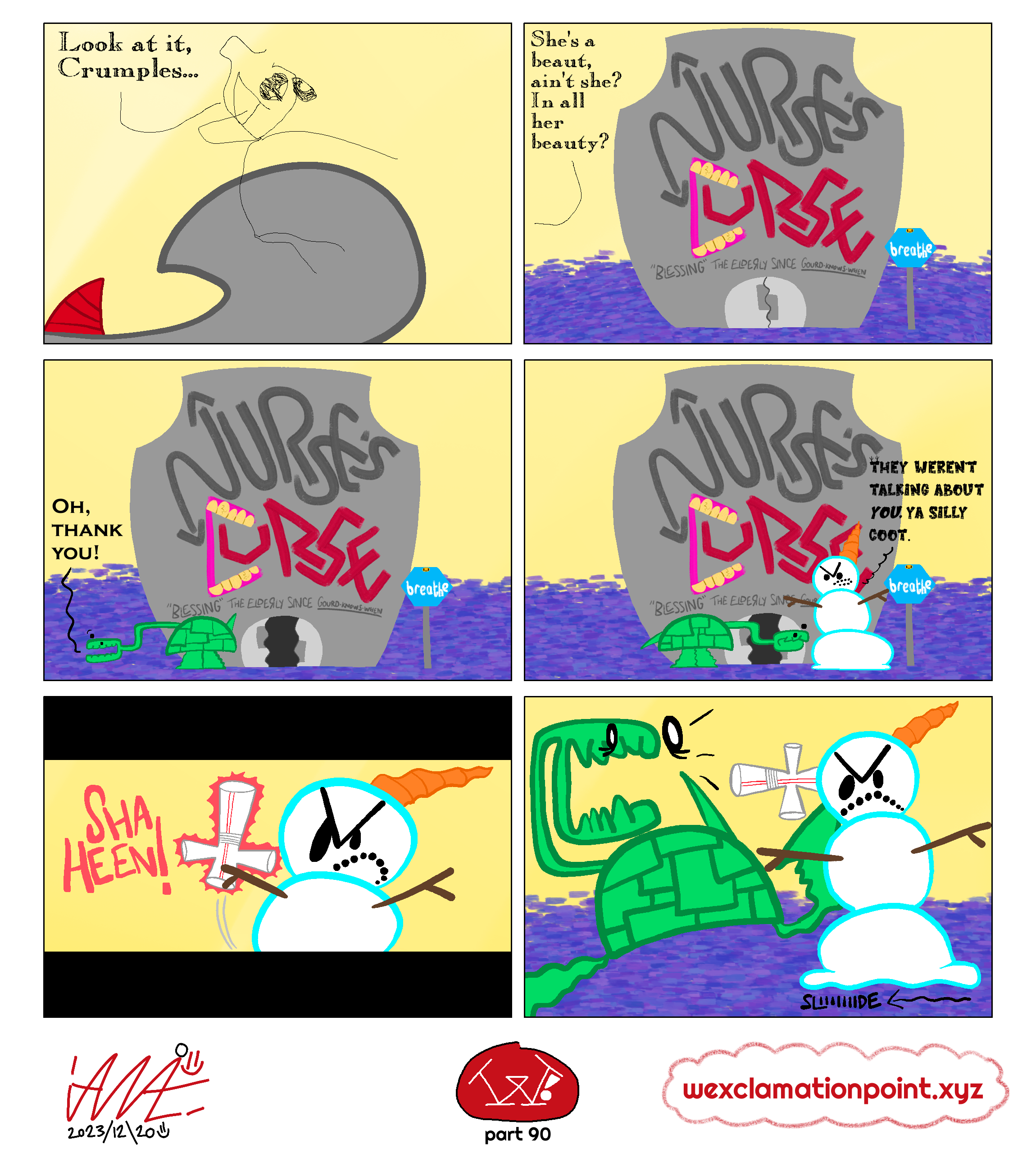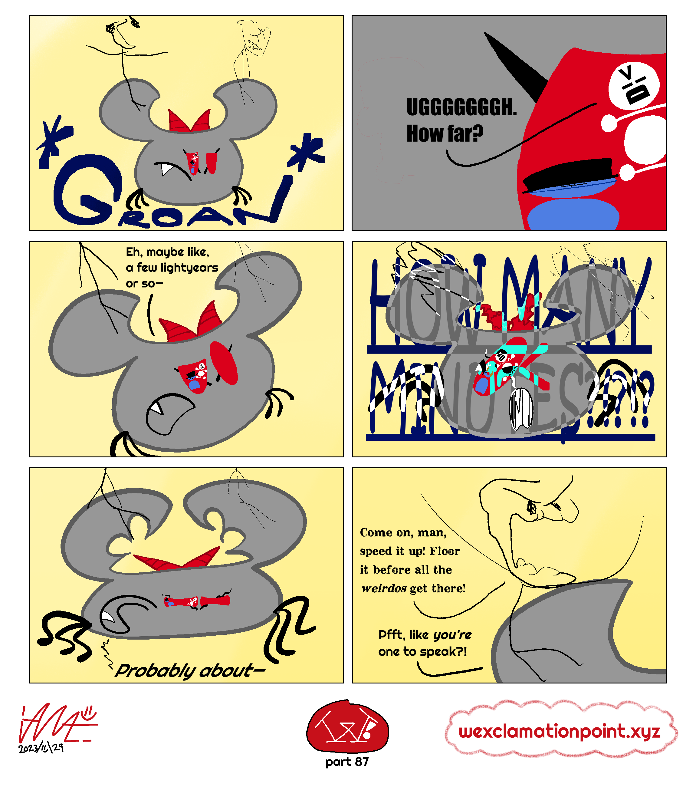 Oh hey, didn’t see ya there! I’m Ian A., usually stylized as “iANA.=)”, and sometimes just “ian=)”. I’m some weirdo who draws a whole lot! One of these things what I draw is called “W!” (Full name: “W! : The Enduring Quest for the W Cookie”) and it’s updated (hopefully) every Wednesday! Or Thursday! It’s about three friends trying to fight off idiots they come across while trying to find a specific W cookie that got stolen! You can check that out at https://wexclamationpoint.xyz =) - I used to have another webcomic—Nothing But Stick Figures—that went from Feb 20, 2016 to Mar 23, 2022. Six years of mediocre punchlines, wow! Oh also I do other things and whatnot, you can see those at https://the-ian-ashleum.neocities.org if you like!