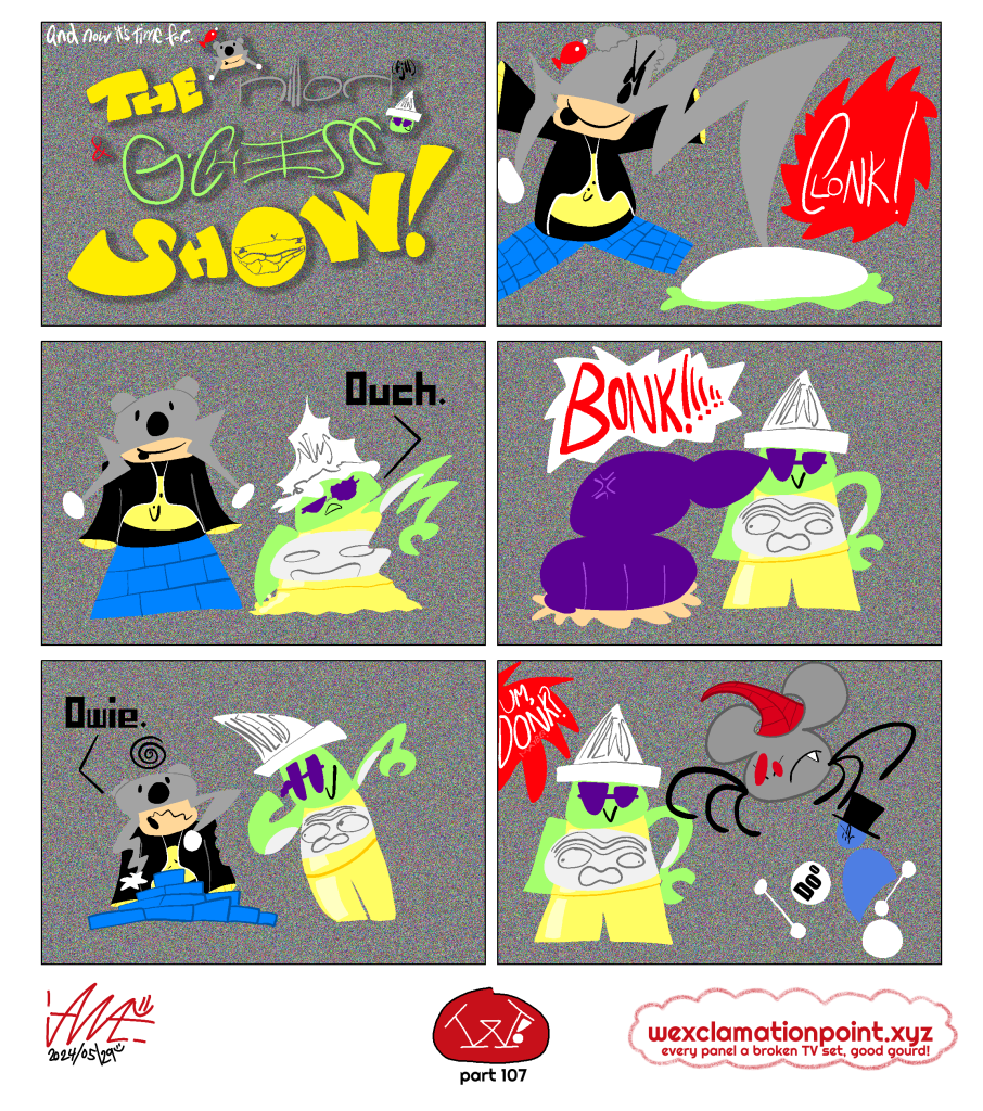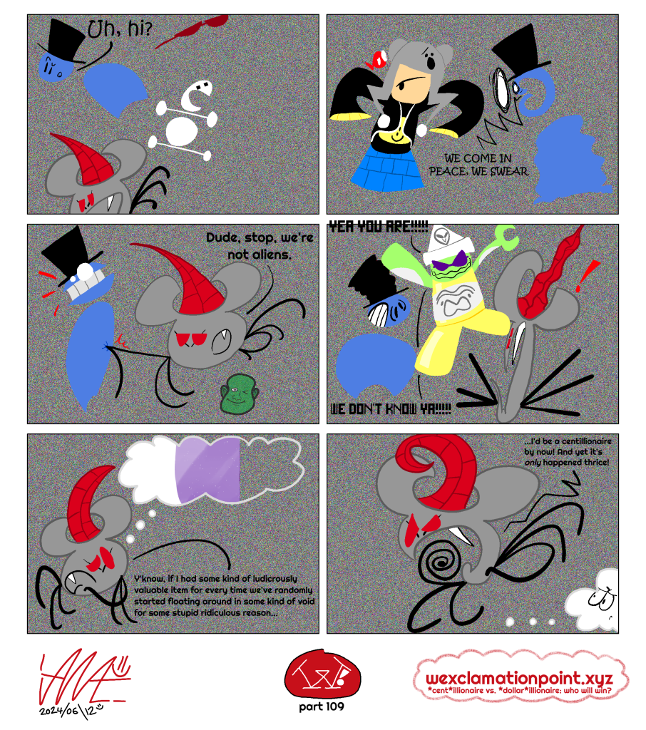 [Chapter C] W!100, WOOHOO On April 10, 2024April 9, 2024 By ian=)Leave a comment all rights to that weird 100 video ian=) found belong to [adult swim] and its parent companies yadda yadda yadda don’t blame us plz but hey, 100 parts of this adventure now! wowzas! —Brady, :colon:, ian=)